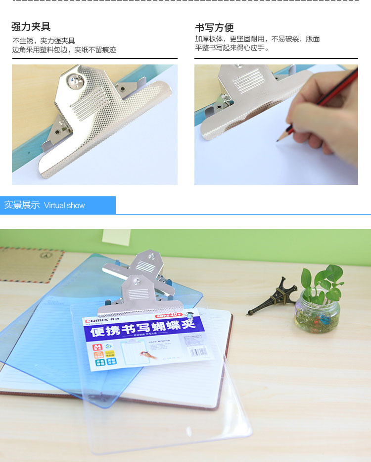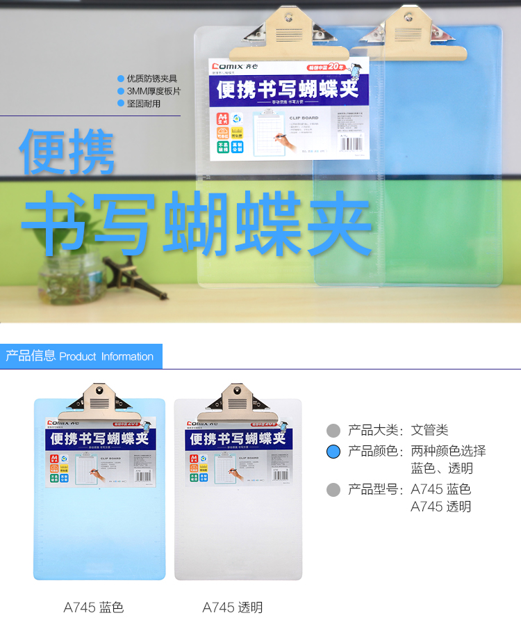 商品名称:齐心(COMIX)A745 书写蝴蝶夹/板夹 颜色随机
