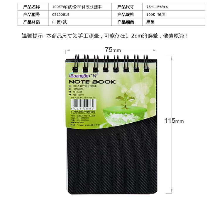 商品名称:广博 GB100815 100K76页办公PP斜纹线圈本