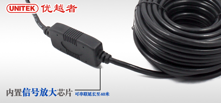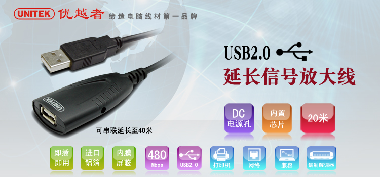 Y-2420 USB2.0 20米延长信号放大线 ◆USB2.0 高速传输线,最大传输速度可高达480Mbps ◆支持热插拔,即插即用 ◆高传导无氧铜,采用7/0.127高规格线径,比普通线材截 面积增大30%以上,传导率更高,信号延长更强 ◆64编和铝箔双层屏蔽,普通线材只有32编或以下,甚至不带铝箔 比普通线缆抗电磁干,扰能力更强,传输稳定,信号清晰 |
