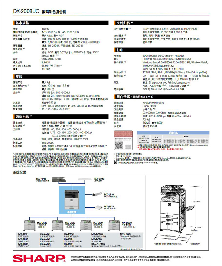 商品名称:夏普(SHARP)DX-2008UC彩色复合机 单层纸盒 主机