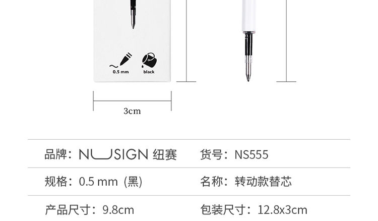 商品名称:纽赛 NS555 转动中性笔芯0.5mm子弹头(黑) 3支/盒 (计价单位:支)