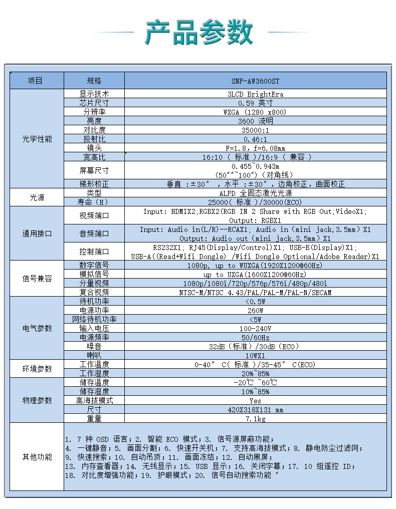 商品名称:索诺克(Sonnoc)SNP-AW3600ST 直投激光短焦液晶投影机(WXGA/3600流明)
