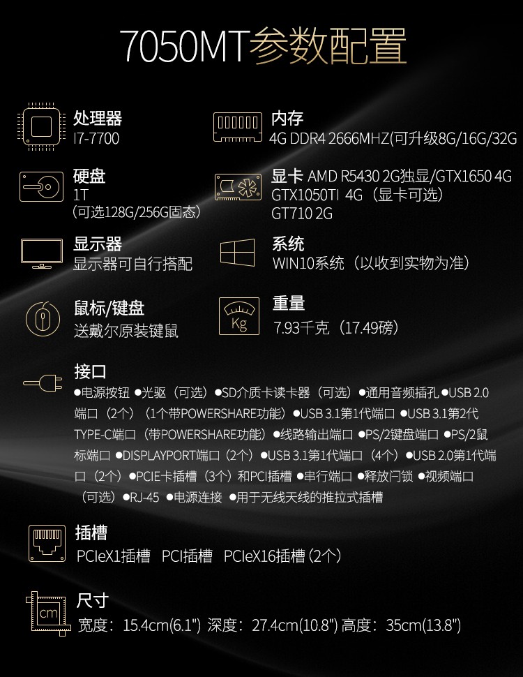 戴尔(DELL)OptiPlex 7050 Tower 240471 台式计算机 i7-6700/8G/2T/独立显卡2G/DVD刻录光驱/3年保修