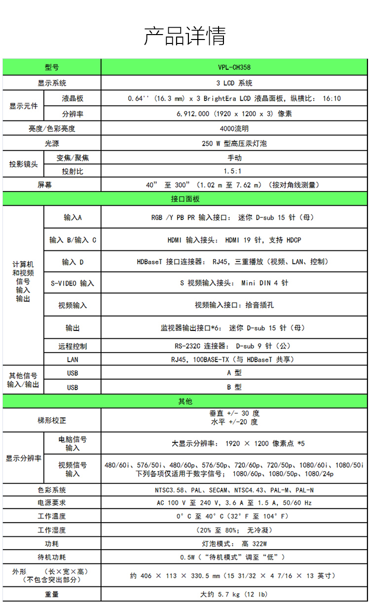 商品名称:索尼(SONY)VPL-CH358 投影仪