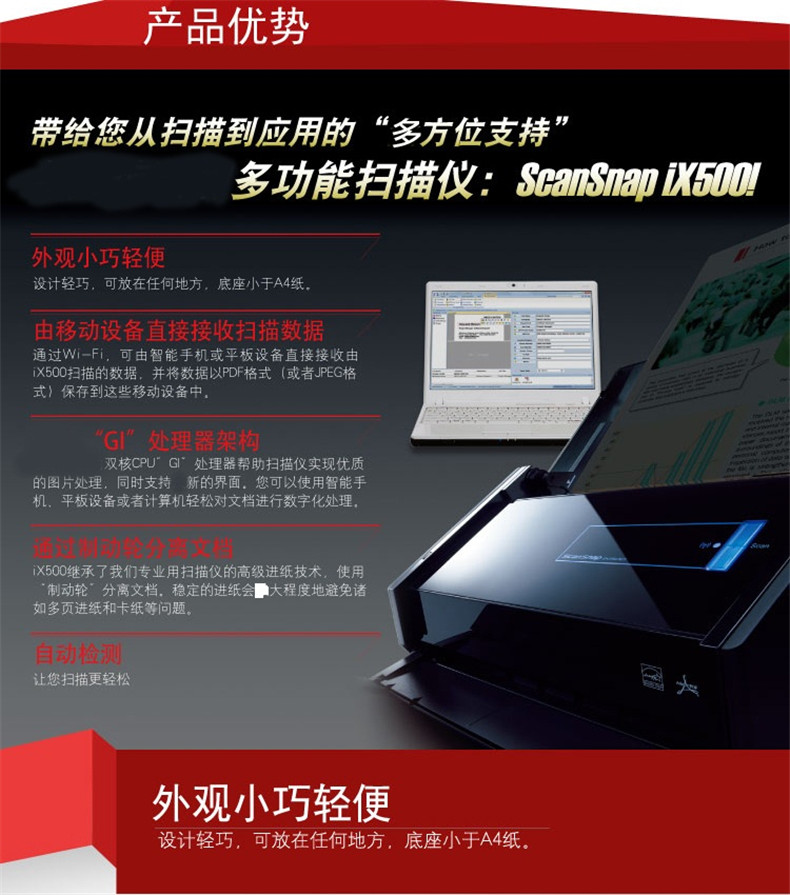 商品名称:富士通(Fujitsu)ix500扫描仪A4高速高清彩色双面自动馈纸WIFI无线传输