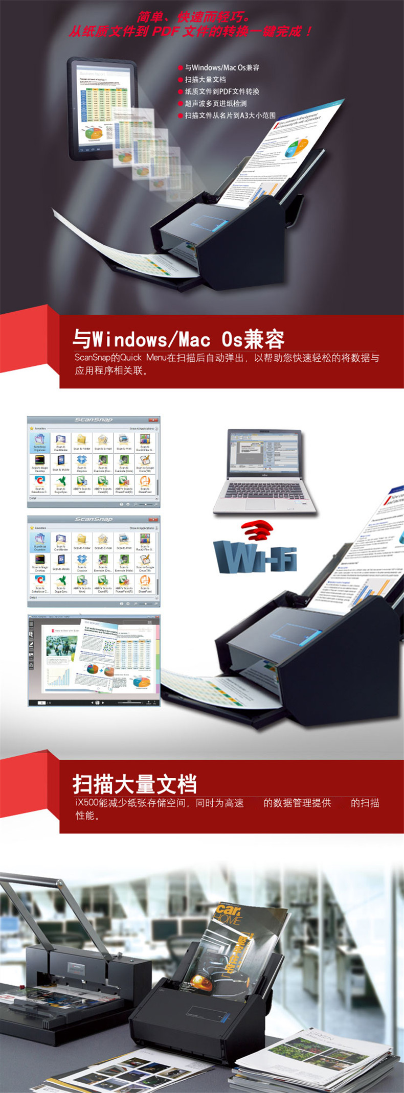 富士通(Fujitsu)ix500扫描仪A4高速高清彩色双面自动馈纸WIFI无线传输
