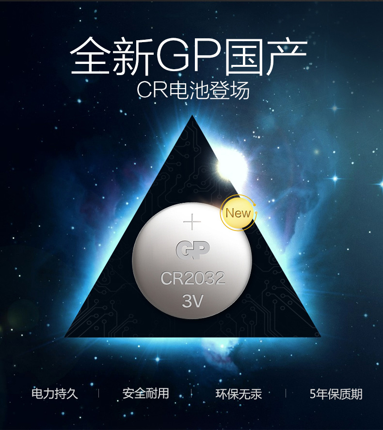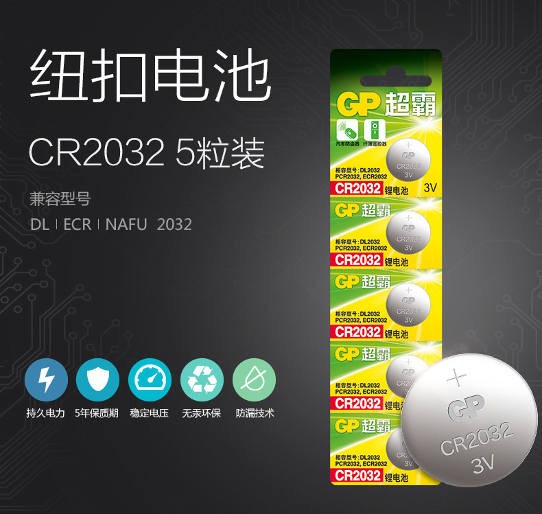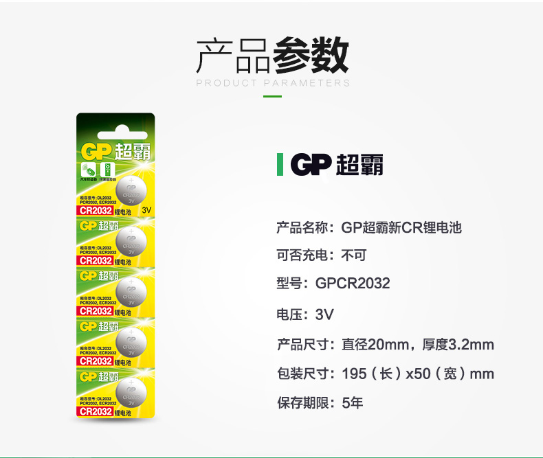 商品名称:超霸(GP) CR2032 纽扣电池 5粒/卡 两卡起送