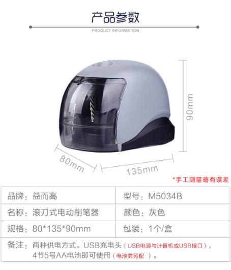 商品名称:益而高 M5034B 滚刀式电动削笔器 USB接口供电/电池供电 灰色