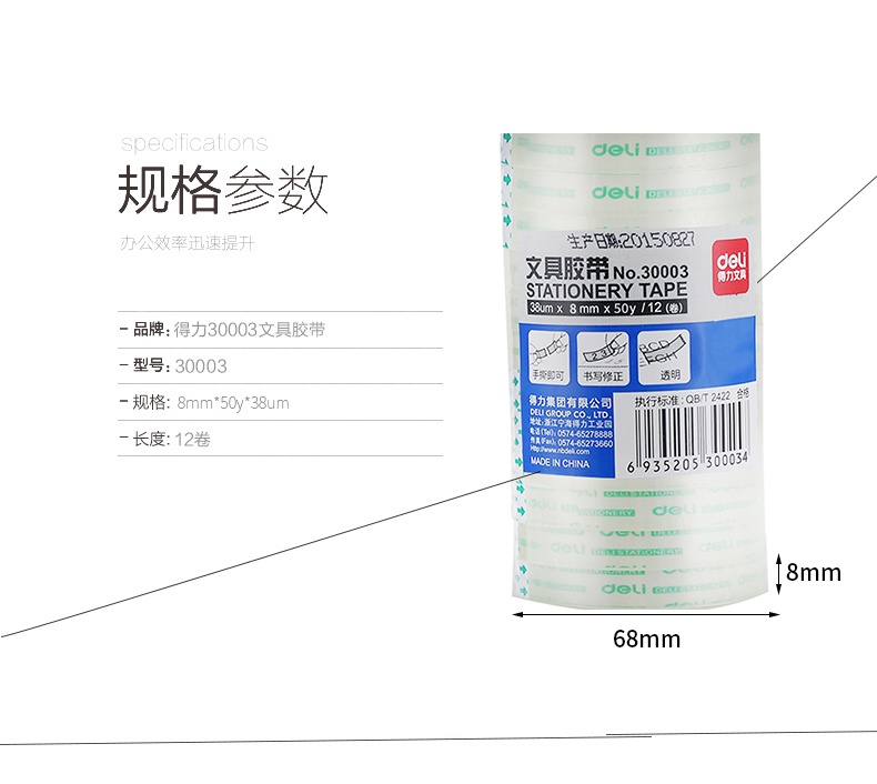 - 商品名称:得力 30003 文具胶带 8mm*50y*38um(12卷/筒) 60/箱