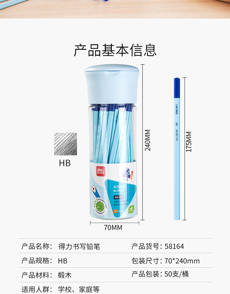 - 商品名称:得力58164_矫姿铅笔50支桶装HB(混)(50支/筒) 8/盒/64/箱 (计价单位:桶)