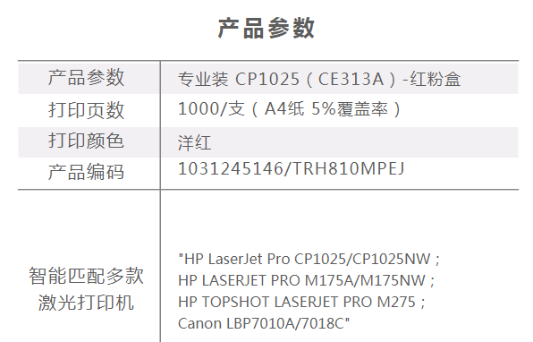 商品名称:天威 HP-CP1025(CE313A)-红粉盒带芯片 专业装 适用于惠普 CP1025/CP1025NW M175A/M175NW 佳能LBP7010A/7018C