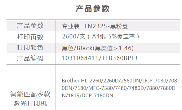 商品名称:天威 BROTHER-TN2325-黑色粉盒 适用于HL-2260/2260D/2560DN DCP-7080/7180 MFC-7380/7480/7880