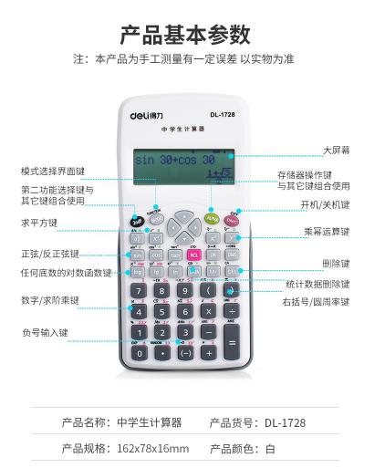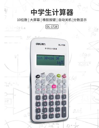 商品名称:得力 1728 中学生函数科学计算器(白色) 20/盒/40/箱