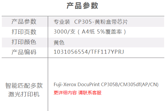 商品名称:天威 CP305 黄色粉盒 专业装 适用于富士 施乐 Fuji-Xerox DocuPrint CP305B CM308df 打印机 墨粉盒 带
