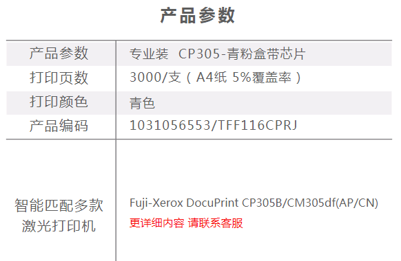 商品名称:天威 CP305 青色粉盒 专业装 适用于富士 施乐 Fuji-Xerox DocuPrint CP305B CM307df 打印机 墨粉盒 带