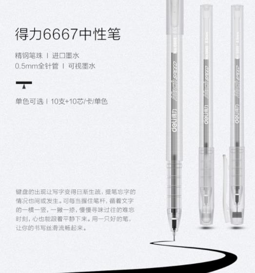 商品名称:得力 6667 中性笔0.5mm全针管(黑)(10+10/卡) 12/盒/144/箱 (计价单位:卡)