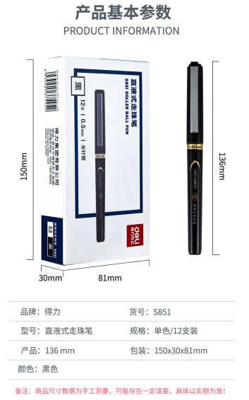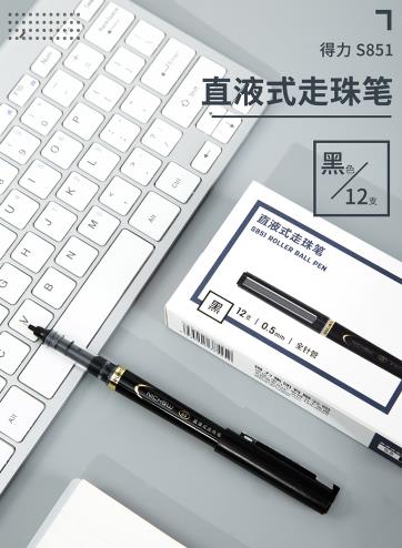 商品名称:得力 S851 直液式走珠笔0.5mm全针管(黑)(12支/盒) 12/盒/144/包1728/箱 (计价单位:支)