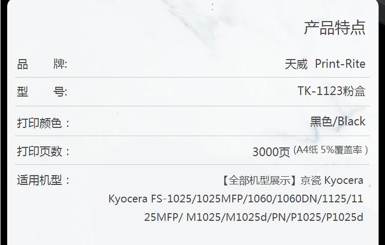 商品名称:天威 KYOCERA-TK1123-黑色复粉粉盒带芯片 经典装 适用于京瓷FS-1060DN/1125MFP/1025MFP/1025d