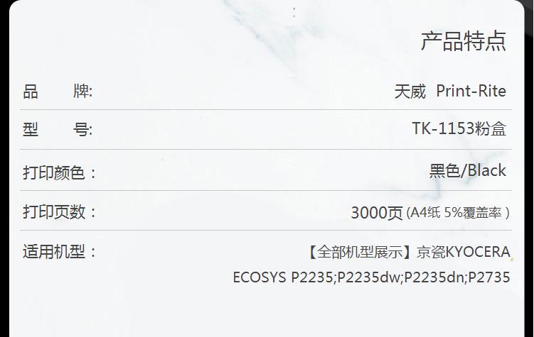 商品名称:天威 KYOCERA-TK1153-BK-100G-黑色复粉粉盒带芯片 经典装 适用于京瓷p2235/2735