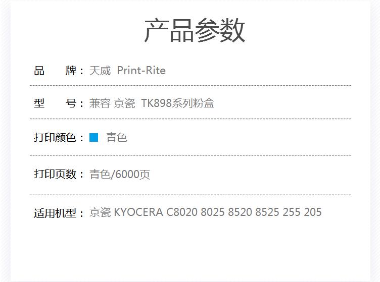 商品名称:天威 KYOCERA-TK898-100G-青复粉粉盒带芯片 经典装 适用于京瓷FS-C8020MFP/8025MFP/C8520MFP/C8525MFP
