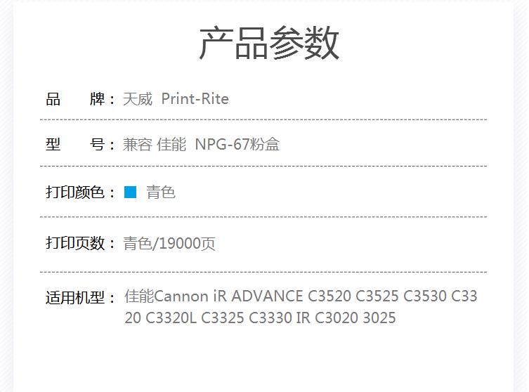 商品名称:天威 CANON-NPG67-460G-青复粉粉盒带芯片 经典装 适用于佳能C3020/C3320/C3320L C3525/C3530/C3350