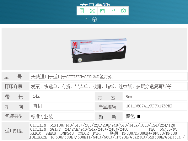 商品名称:天威 CITIZEN-GSX120D-14m,8mm-黑色直架 用于200GX/124D/224S GSX130/140/140+ SWIFT 24/24E/24S