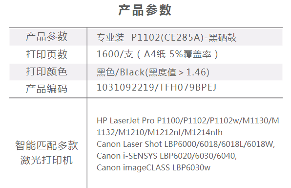 商品名称:天威 HP-P1102(CE285A)-黑色通用硒鼓带芯片-新版 专业装 适用于惠普P1102/P1102w/M1132 佳能LBP6000/6000B /6000B