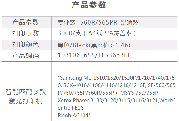 商品名称:天威 SAMSUNG-SF-560R/565PR-黑色通用硒鼓带芯片 专业装 适用于ML-1510/1520/1520P 施乐3130/3120/3115 理光AC104