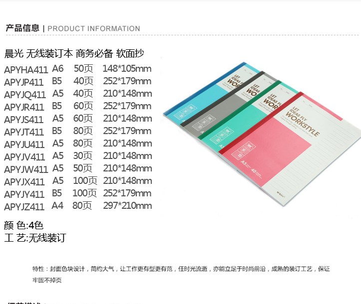 商品名称:APYJX411 A5无线装钉本100页 5本/包晨光