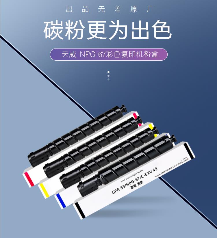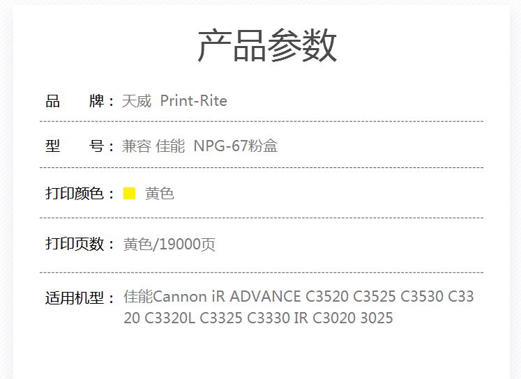 商品名称:天威 CANON-NPG67-460G-黄复粉粉盒带芯片 经典装 适用于佳能C3020/C3320/C3320L C3525/C3530/C3350