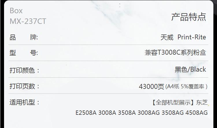 商品名称:天威 TOSHIBA-T3008C-700G-黑色复粉粉盒带芯片 经典装 适用于东芝E2508A/3008A/3508A/3008AG/3508AG/4508AG
