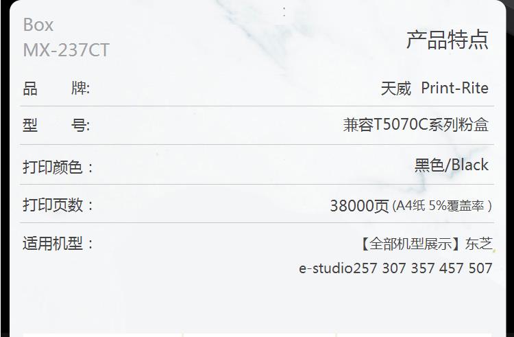商品名称:天威 TOSHIBA-T5070C-700G-黑色复粉粉盒带芯片 经典装 适用于东芝257/307/357/457/507
