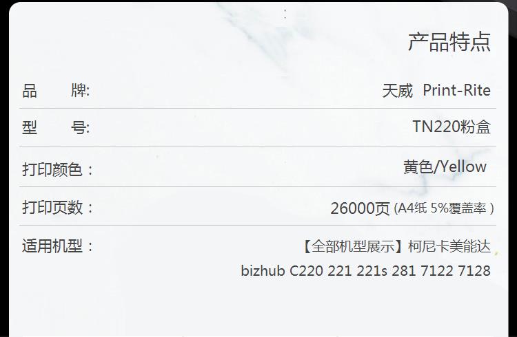 商品名称:天威 KONICA MINOLTA-TN220-510G-黄复粉粉盒 经典装 适用于柯尼卡美能达C221/C221S/C281/C7122/C7128
