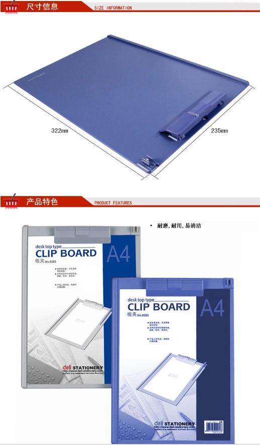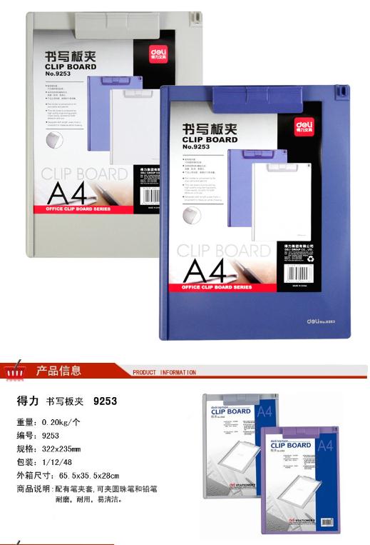 - 商品名称:得力 9253 塑料书写板夹(混)(只) 12/盒/48/箱
