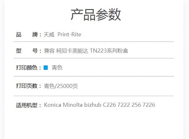 商品名称:天威 KONICA MINOLTA-TN223-430G-青复粉粉盒 经典装 适用于柯尼卡美能达c226/c256/c66/c7222/c7226