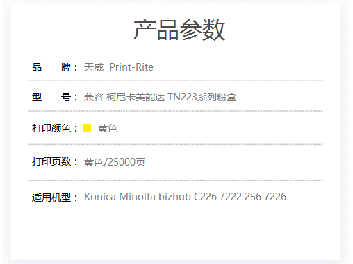 商品名称:天威 KONICA MINOLTA-TN223-430G-黄复粉粉盒 经典装 适用于柯尼卡美能达c226/c256/c66/c7222/c7226