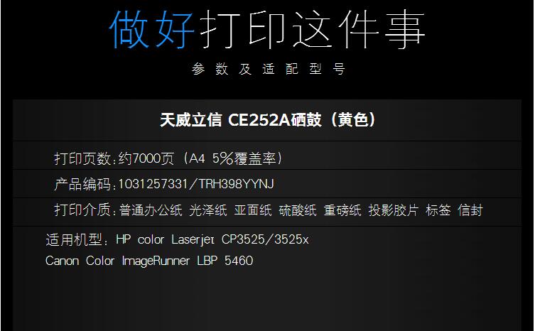 商品名称:天威立信 CE252A 黄通用硒鼓 适用于Laserjet CP3525/3525x LBP 5460 立信装