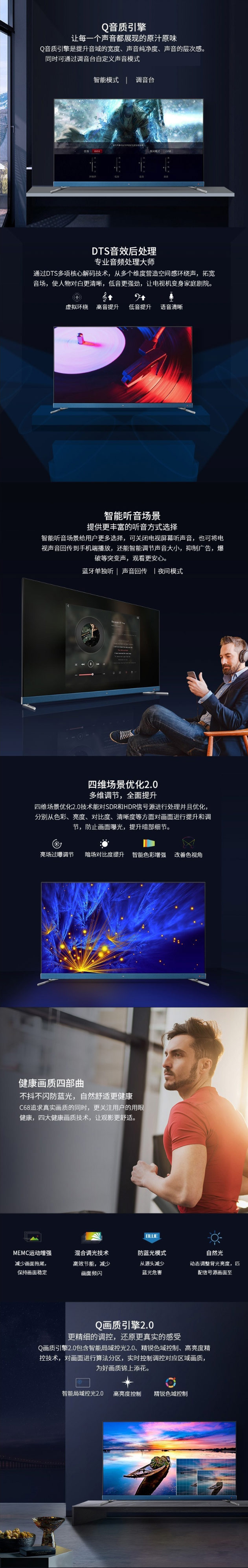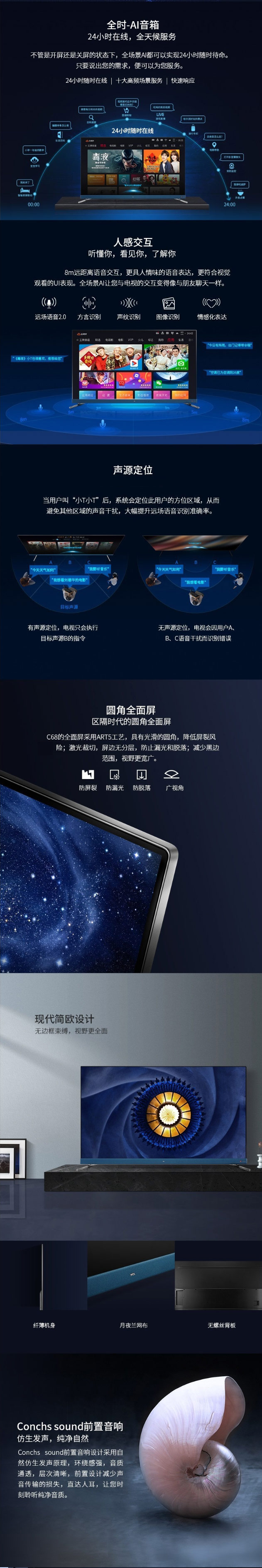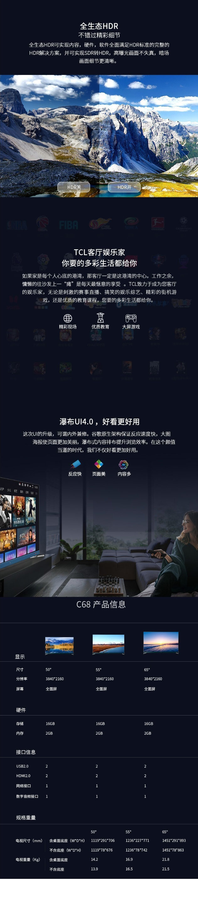 商品名称:TCL 50C68 4K超高清 全生态HDR 圆角全面屏 全场景AI 电视 黑色