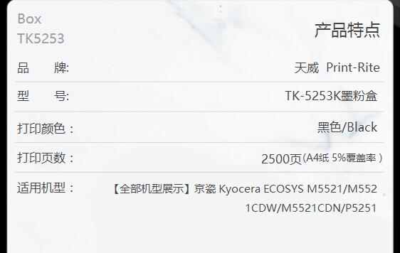 商品名称:天威 KYOCERA-TK5253-35G-黄复粉粉盒带芯片 经典装 适用于京瓷P5251