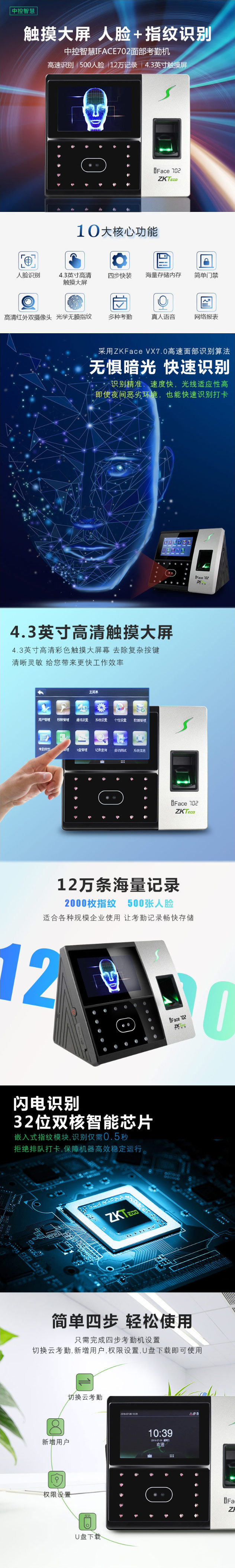 - 商品名称:中控智慧 ZKTeco iFace702+BS人脸指纹混合识别考勤机 高速打卡机模块