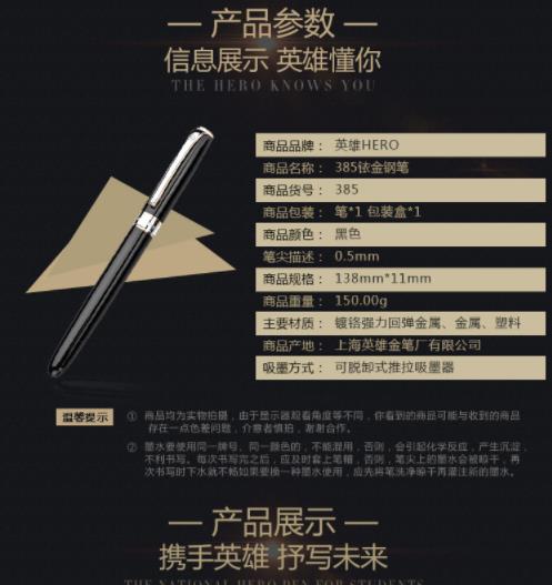 商品名称:英雄(HERO)385 铱金钢笔墨水笔明尖 黑色