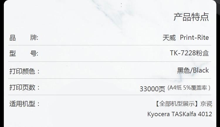 商品名称:天威 KYOCERA-TK-7228--BK-黑色复粉盒带芯片 经典装 适用于京瓷TASKalfa 4012