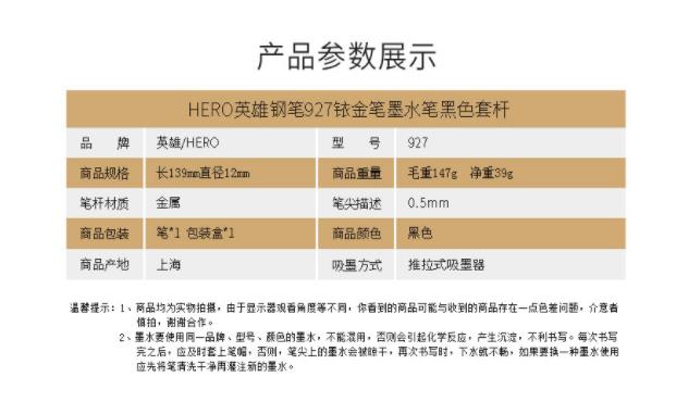 商品名称:英雄(HERO)黑色铱金钢笔墨水笔明尖 927