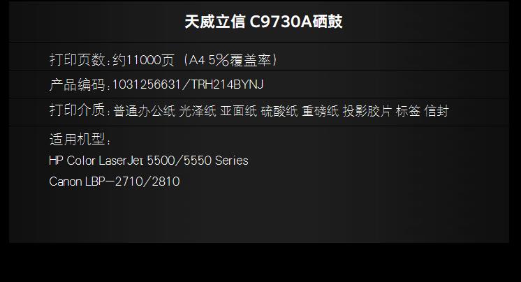 商品名称:天威立信C9730A黑硒鼓 适用于HP-5500/5550 Series Canon LBP-2710/2810