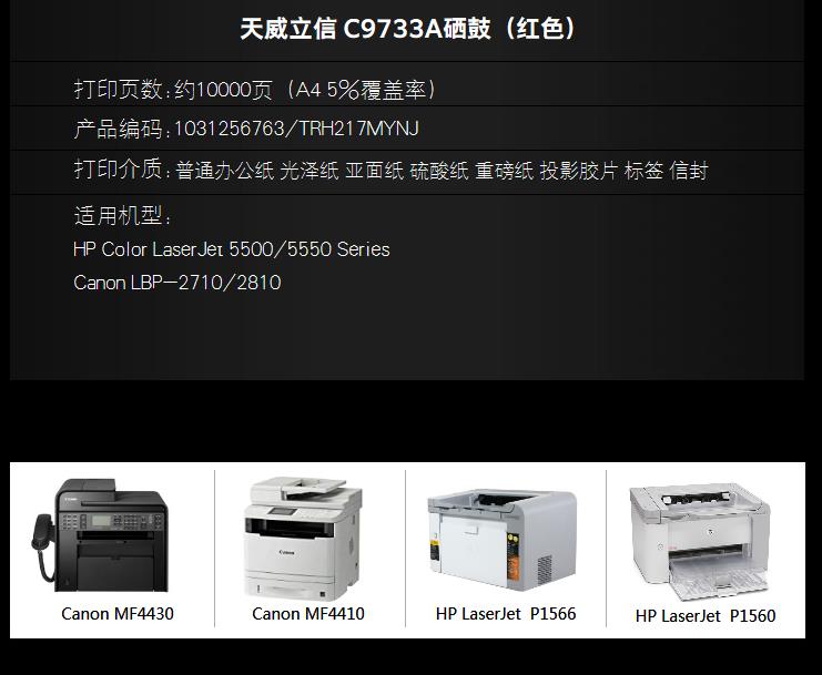 商品名称:天威立信C9733A 硒鼓 红色 适用于HP-5500/5550 Series Canon LBP-2710/2810