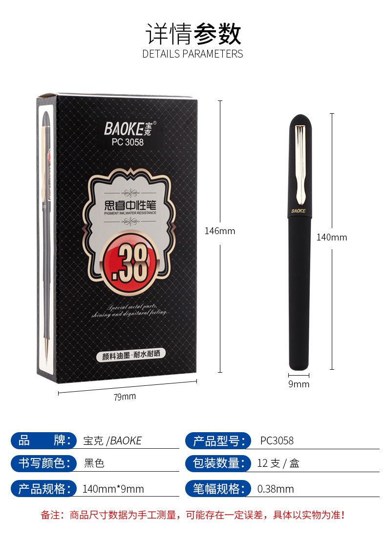 商品名称:宝克(BAOKE)0.38mm黑色中性笔PC3058全针管水笔 黑色(1盒/12支)