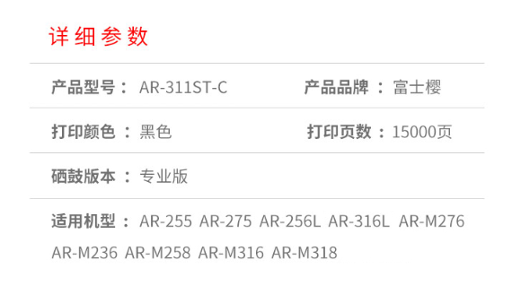 商品名称:富士樱 AR-311ST-C 黑色墨粉盒 适用夏普 AR-255 275 256L 316L AR-M276 M236 M258 M318 M316硒鼓