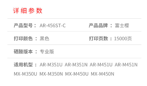 商品名称:富士樱 AR-456ST-C 黑色墨粉盒 适用夏普 AR-M351U/N AR-M451U/N MX-M350U/N MX-M450U/N 黑色复印机碳粉盒