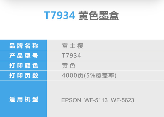 商品名称:富士樱 T7934 黄色墨盒 适用爱普生EPSON WF-5113 WF-5623 喷墨仓式打印机(颜料墨水)