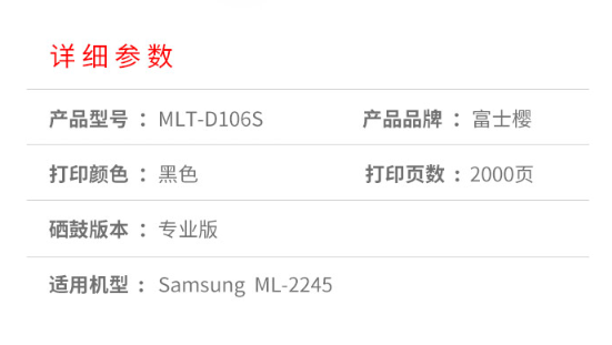 商品名称:富士樱 MLT-D106S 墨粉盒 适用三星Samsung ML-2245 打印机粉盒(需配硒鼓架使用)